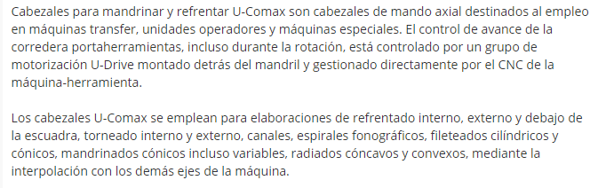 Características generales Los cabezales U-Comax están diseñados para su uso en máquinas de transferencia, unidades operativas y máquinas especiales.El control del avance del carro de la herramienta, incluso durante la rotación, es controlado por una unidad de motorización U-Drive montada en la parte trasera del husillo y gestionada directamente por el CNC de la máquina herramienta.Los cabezales U-Comax se utilizan para soldadura fuerte interna, externa y subcuadrante, torneado interno y externo, canales, espirales fonográficos, roscas cilíndricas y cónicas, escariadores cónicos, incluso radios variables, cóncavos y convexos, por interpolación con los otros ejes del máquina.