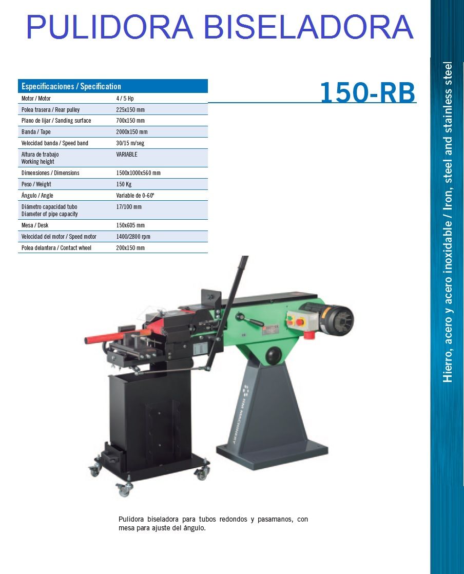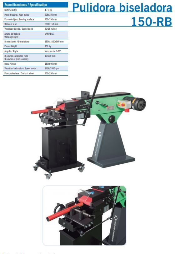 - Motor: 4 / 5 Hp. - Polea trasera: 225 x 150 mm. - Plano de lijar: 700 x 150 mm. - Banda: 2250 x 150 mm. - Velocidad banda: 30 / 15 m/seg. - Altura de trabajo: Variable. - Ángulo: Variable de 0-60 º. - Diámetro capacidad tubo: 17 / 100 mm. - Mesa: 150 x 605 mm. - Velocidad del motor: 1400 / 2800 rpm. - Polea delantera: 200 x 150 mm.