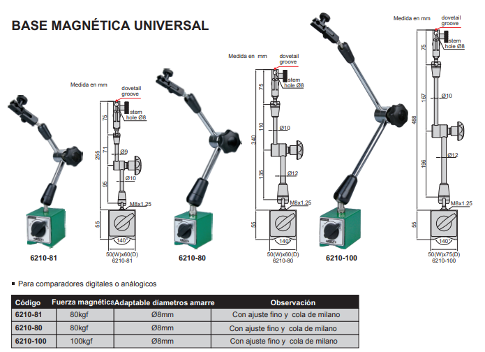Es un soporte magnético con ajuste fino, ideal para los trabajos mas delicados. - Fuerza magnetica 80 Kgf - Base 63 x 50 x 55 mm - Con ajuste preciso - Abrazadera con agujero de 8 mm - Para indicadores con plano posterior - Base magnetica con interruptor on/off - Caja de carton - Peso 1.9 kg